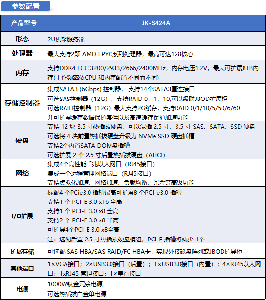 JK-S424A 是一款基于 AMD EPYC平台的双路 2U 旗舰服务器,专为 AI 推理、科学计算、大数据分析及企业关键业务等高负载场景打造。相比前代,多核算力、内存带宽与 I/O 性能全面提升,支持双路高性能 GPU 计算卡,深度释放 EPYC 架构潜力,在提供大规模算力的同时兼顾通用业务稳定性,为科研、医疗、互联网及企业级数据中心提供高效能、高可用的核心算力解决方案。