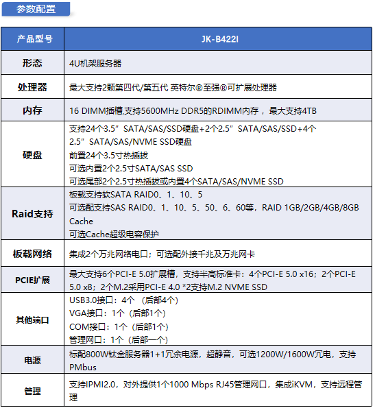 JK-B422I 是基于 Intel Eagle Stream 平台的 4U 存储型服务器,专为海量数据存储、虚拟化及云服务场景打造。支持新一代至强可扩展处理器,最高支持 4TB 内存,前置标配 24 块 3.5 英寸热插拔硬盘,可选多种 SSD 配置,并可灵活扩展 PCIe 5.0 设备。产品采用高集成模块化设计,搭载先进管理功能与企业级存储技术,兼具高可靠性、易维护性、出色扩展性与业务高可用能力。